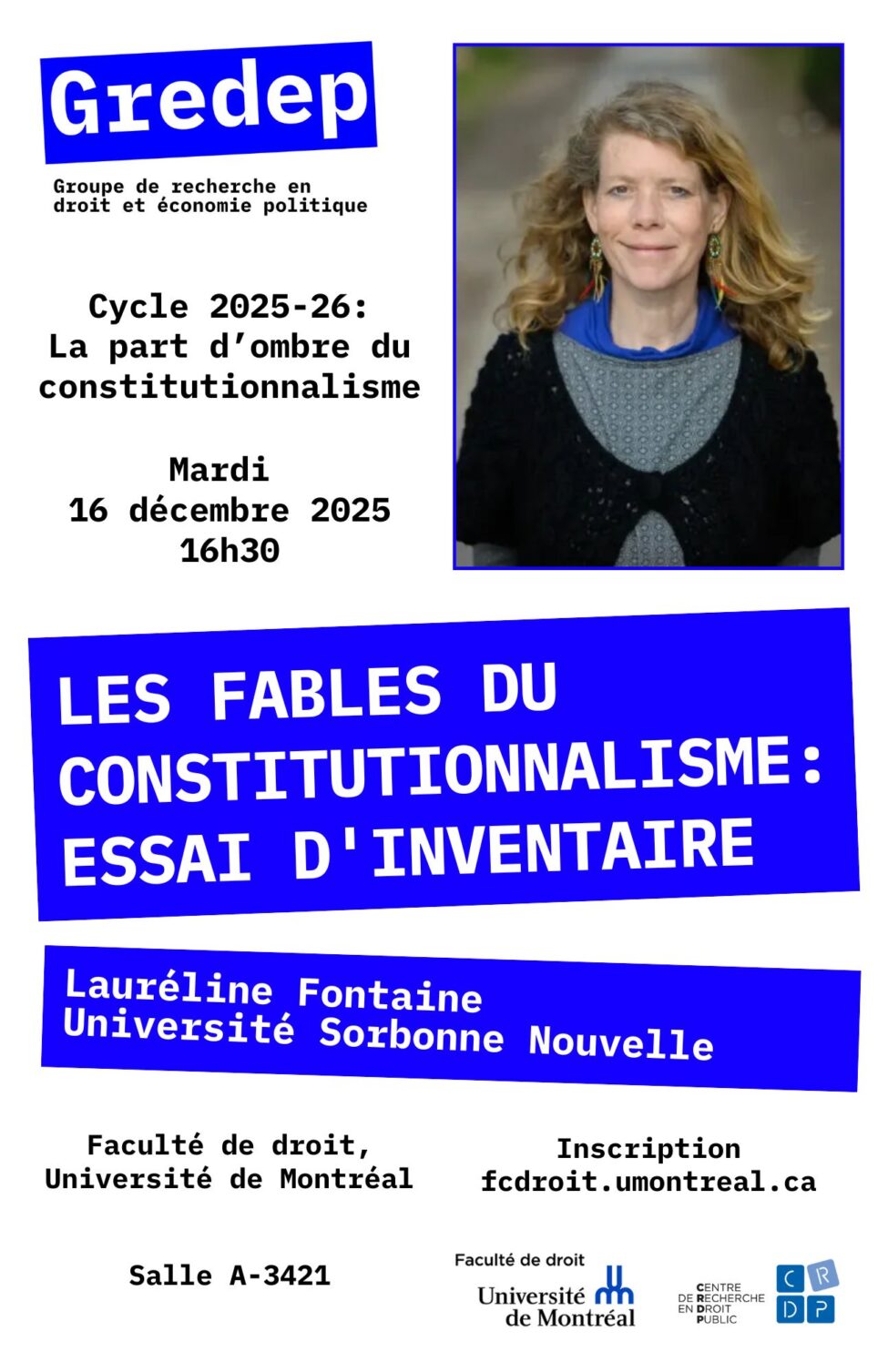 Le Groupe de recherche en droit et économie politique a le plaisir de vous inviter à la deuxième conférence du cycle « La part d’ombre du constitutionnalisme ». Intitulée « Les fables du constitutionnalisme : essai d’inventaire », cette conférence sera donnée par la Professeure Lauréline Fontaine (Université Sorbonne Nouvelle).