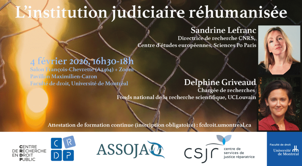 Nous sommes ravis de vous inviter à la conférence sur « L’institution judiciaire réhumanisée », organisée en collaboration avec l’Association des organismes de justice alternative du Québec (ASSOJAQ) et le Centre de service de justice réparatrice (CSJR).