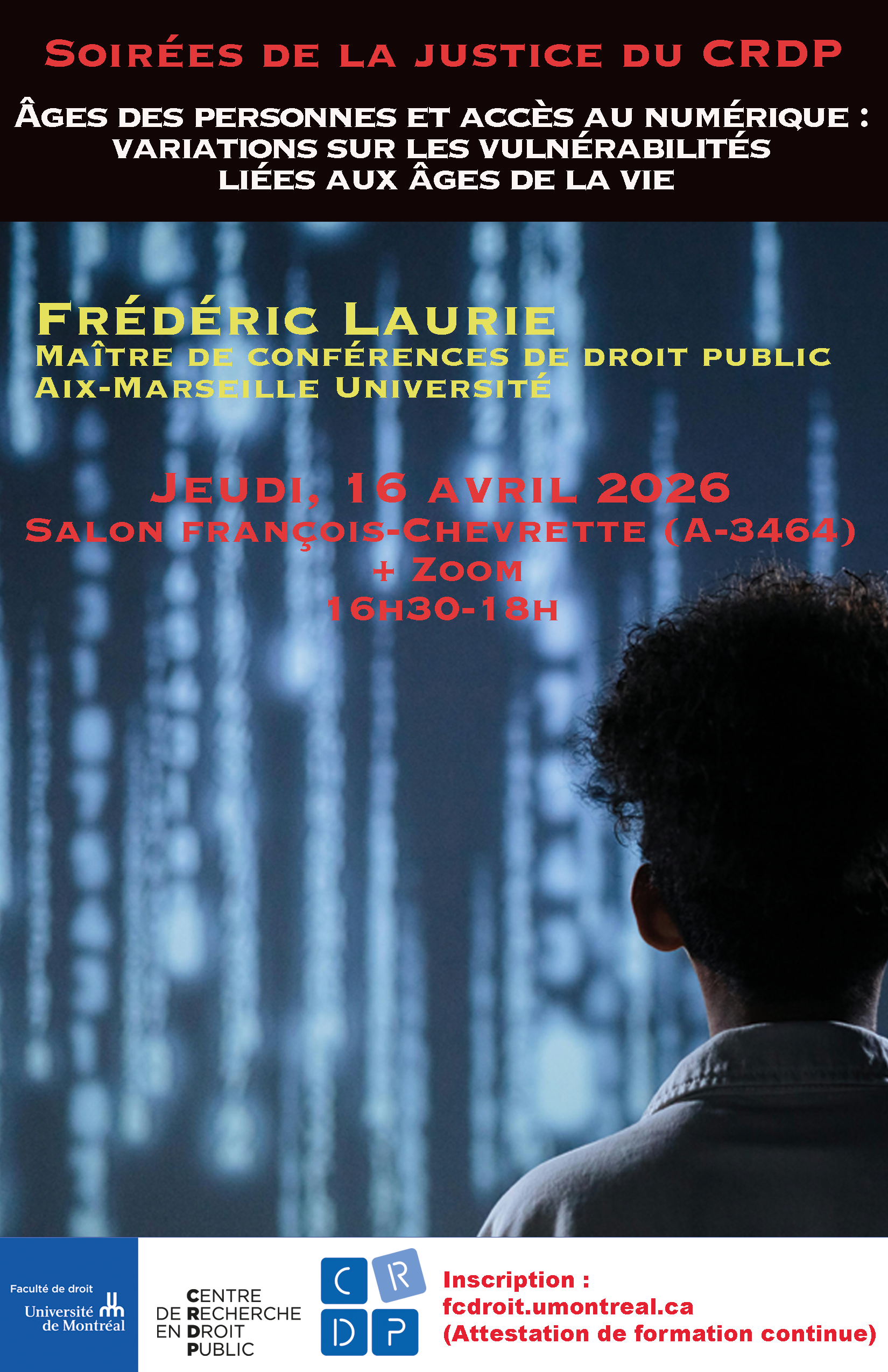 Nous vous le plaisir de vous convier à la conférence Âges des personnes et accès au numérique : variations sur les vulnérabilités liées aux âges de la vie, dans le cadre du cycle Soirées de la justice du CRDP.