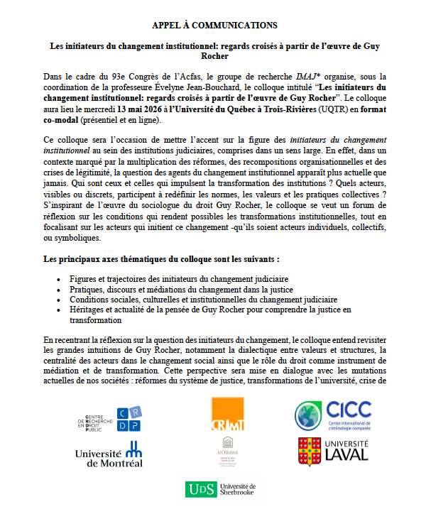 APPEL À COMMUNICATIONS Les initiateurs du changement institutionnel: regards croisés à partir de l’oeuvre de Guy Rocher   Dans le cadre du 93e Congrès de l’Acfas, le groupe de recherche IMAJ* organise, sous la coordination de la professeure Évelyne Jean-Bouchard, le colloque intitulé “Les initiateurs du changement institutionnel: regards croisés à partir de l’oeuvre de […] Lire la suite