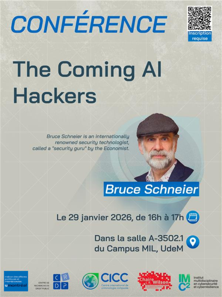 Nous avons le plaisir de vous inviter à la conférence The Coming AI Hackers, organisée par le Centre international de criminologie comparée, en collaboration avec le CRDP et la Chaire L.R. Wilson. Date : 29 janvier 2026 Heure : 16H – 17H Lieu : Salle A-3502.1, Campus MIL, Université de Montréal + ZOOM Abstract Hacking is inherently a creative […] Lire la suite